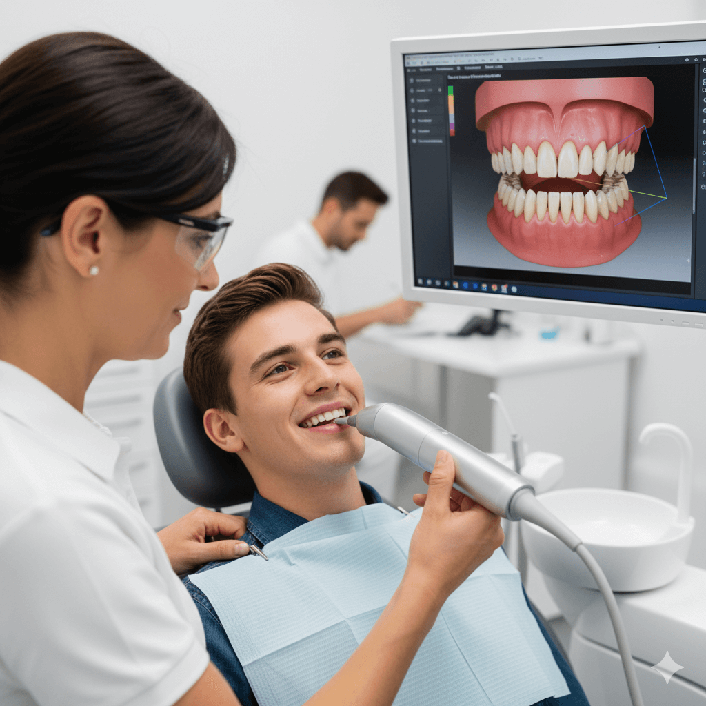 Nach dem Beratungsgespräch wird der zu behandelnde Bereich mit CEREC Primescan oder CEREC Omnicam aufgenommen.