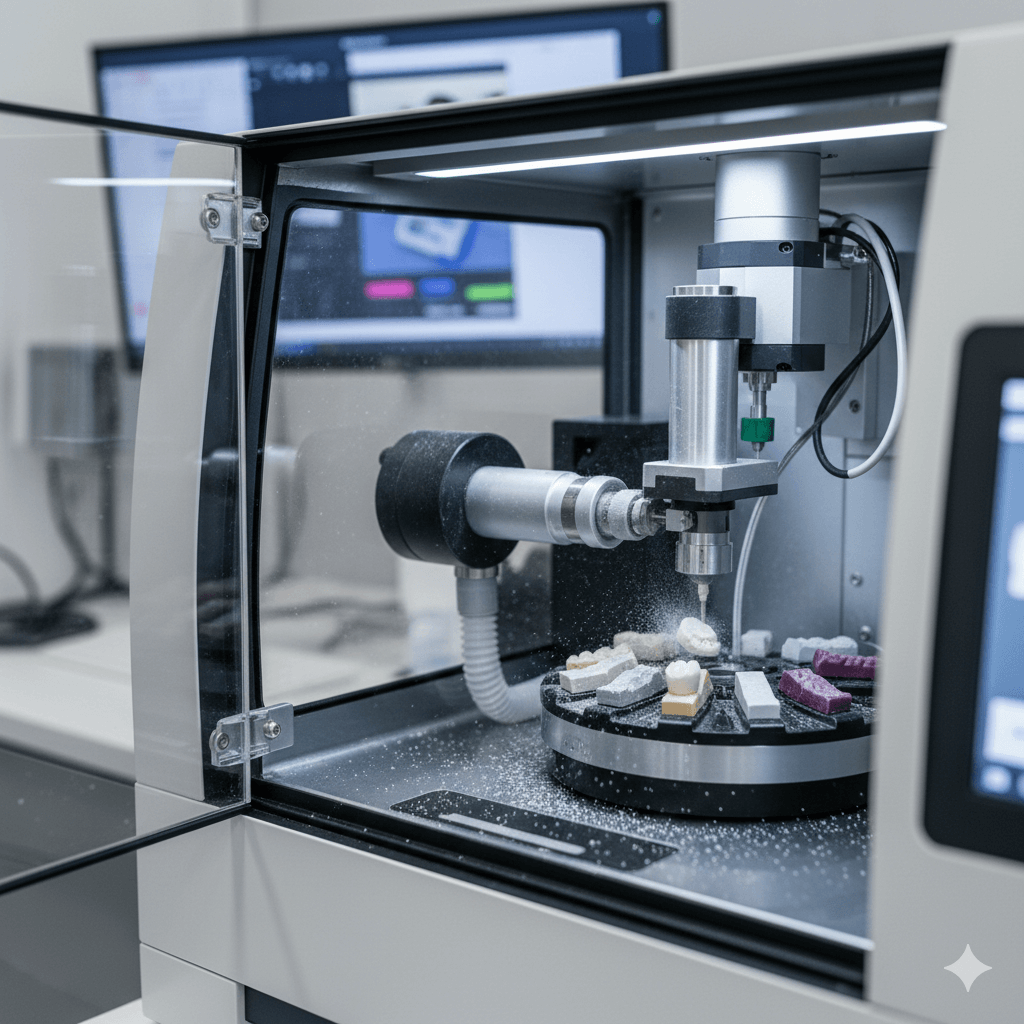 Gleich im Anschluss wird die Restauration direkt in der Praxis innerhalb kurzer Zeit aus einem Materialblock ausgefräst.